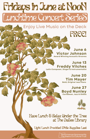 Join us for our Fridays in June at Noon Concert Series—a free, family-friendly event held outdoors on the library’s beautiful deck, beneath the cooling shade of our majestic Sycamore tree. Each Friday at noon throughout the month of June, we welcome the community to relax, enjoy live music, and celebrate the joy of shared experience.