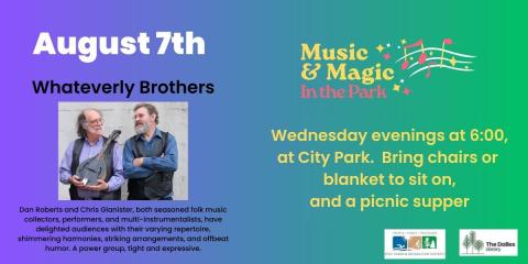 Time for the 2nd annual Music & Magic in the Park! This family friendly event is held in partnership with Northern Wasco County Parks & Rec, will be at 6:00 on Wednesday evenings, June 19th through August 14th. Each week will feature a different performer, always family friendly, and always free of charge.