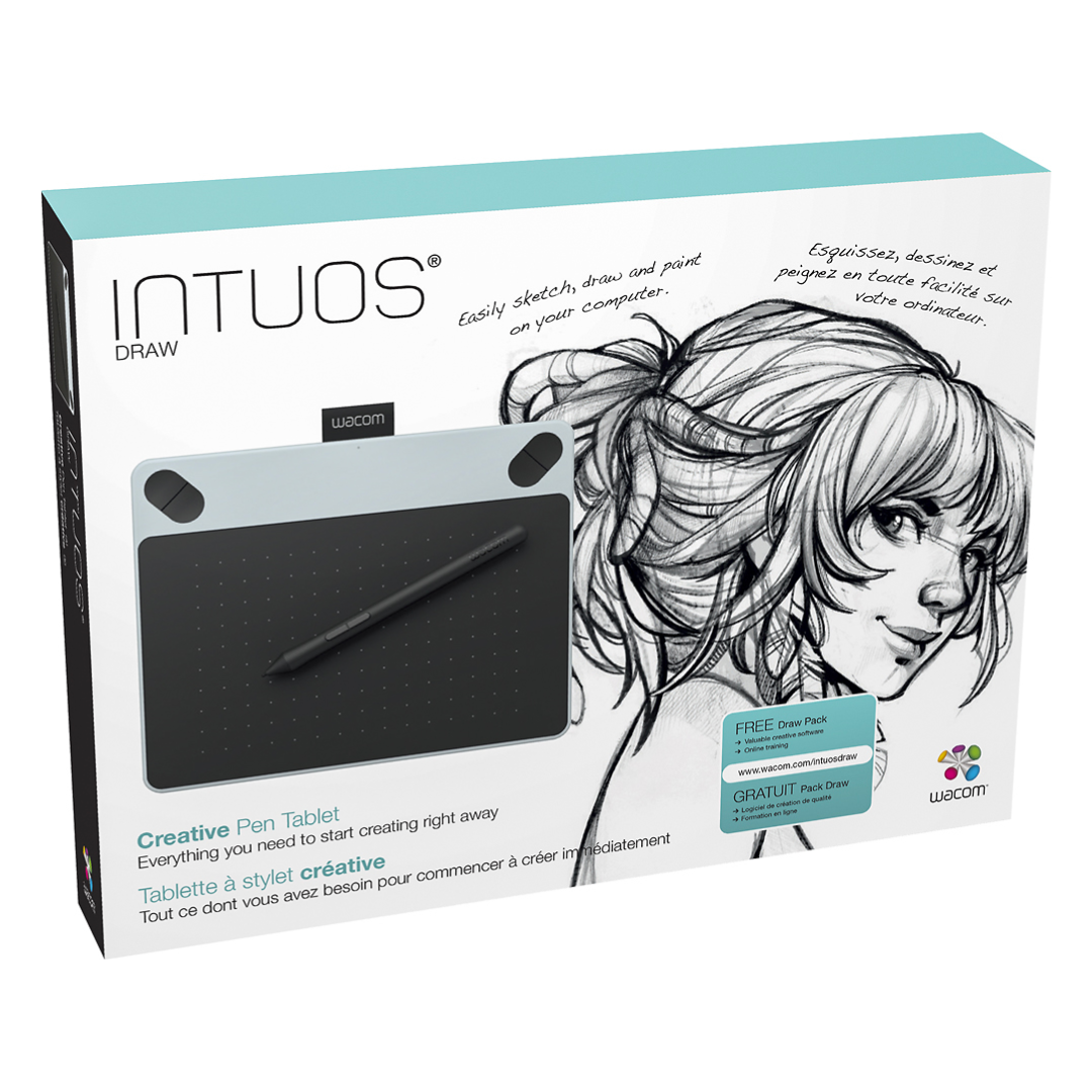 Intuos Draw creative pen tablet. Ergonomic, slim tablet design. Battery-free, ergonomic, pressure-sensitive pen with two buttons and eraser.